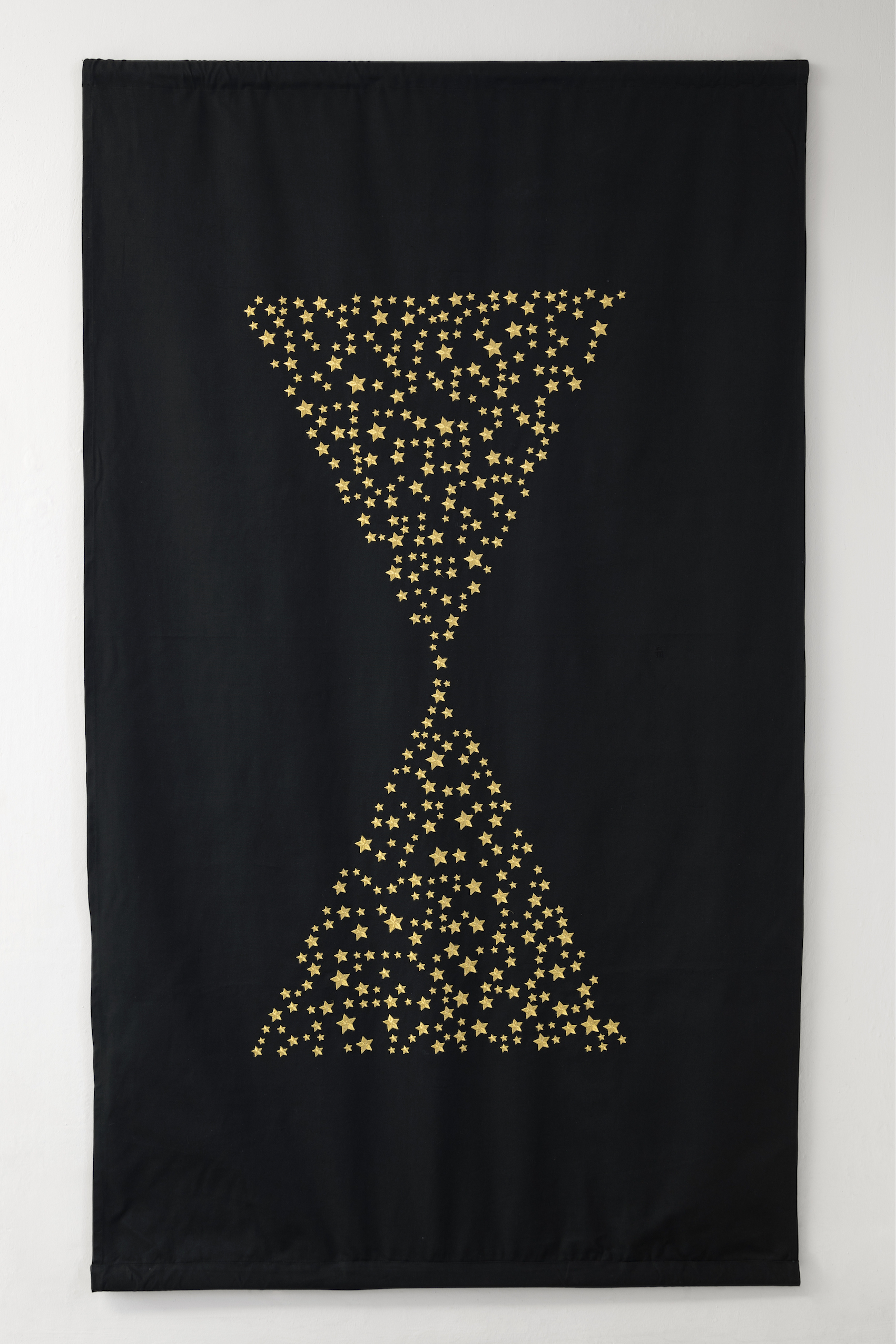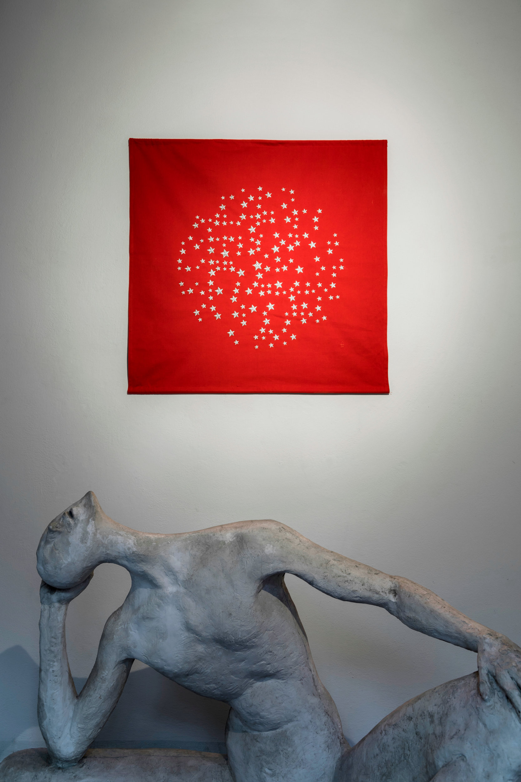 La mostra presenta 15 lavori tessili ricamati, frutto di una reinterpretazione poetica da parte dell’artista del linguaggio braille attraverso la sostituzione dei tradizionali punti con stelle, espandendone in questo modo i confini con nuovi significati e suggestioni.